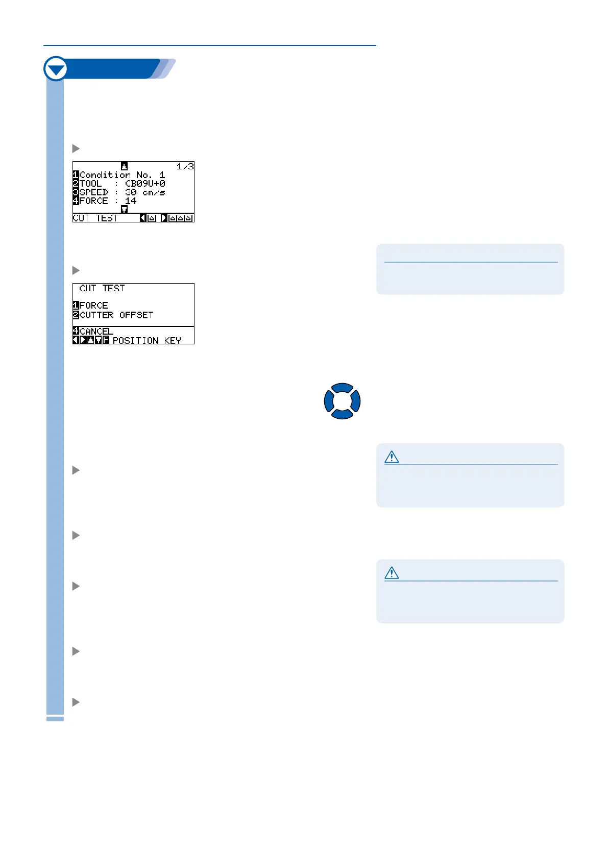 3 cutting test patterns are cut, with current FORCE in the center, and 1 each