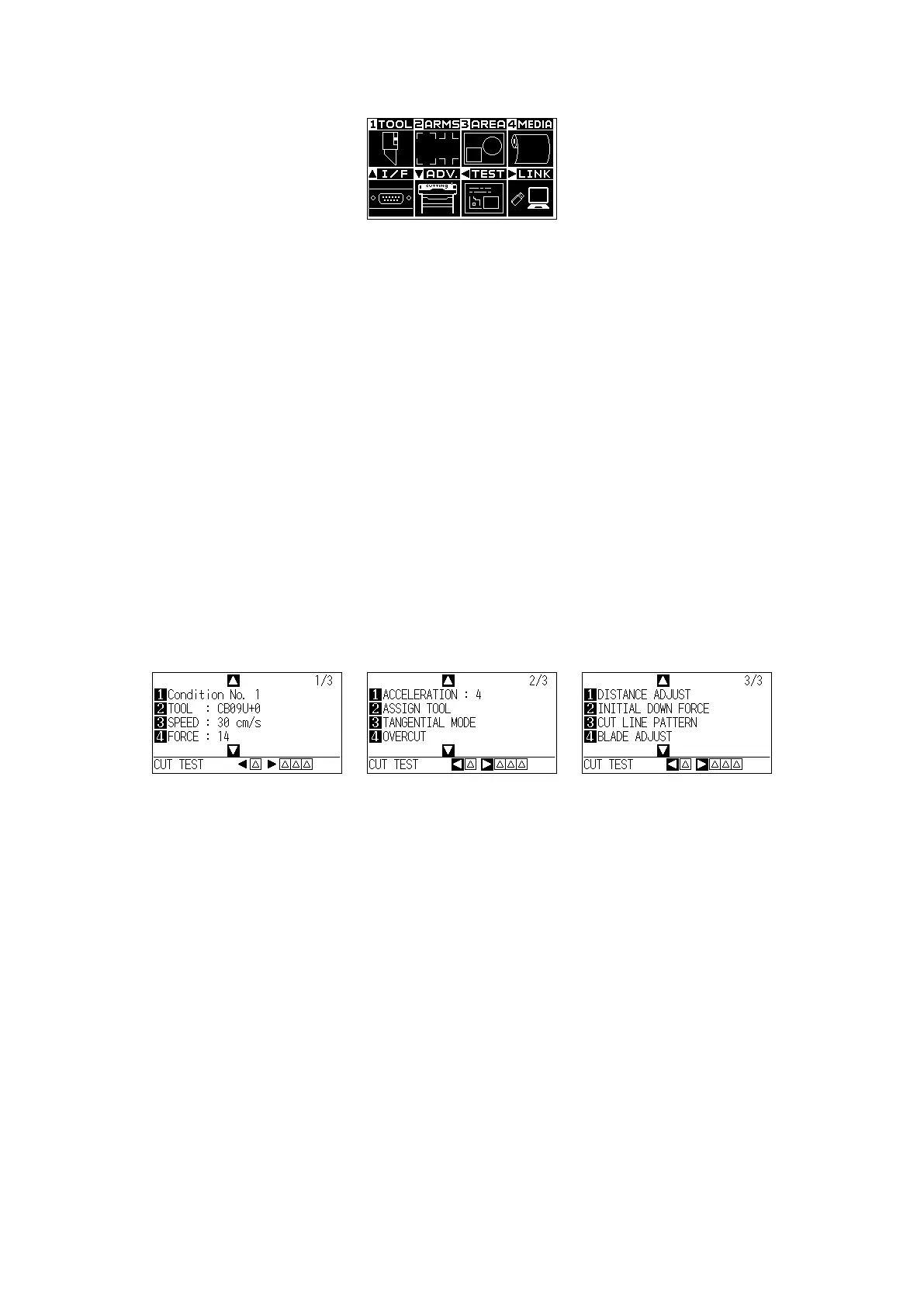 [3] (AREA): ........... Make the settings for area, magnification, rotation, reverse, etc., of the cutting.