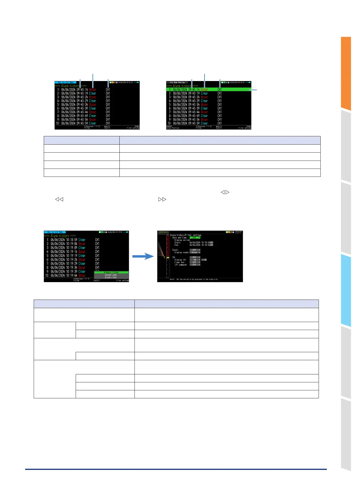 Description of the alarm history screen