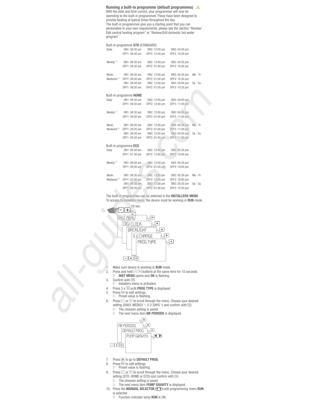 The built-in programmes can be selected in the INSTALLERS MENU.