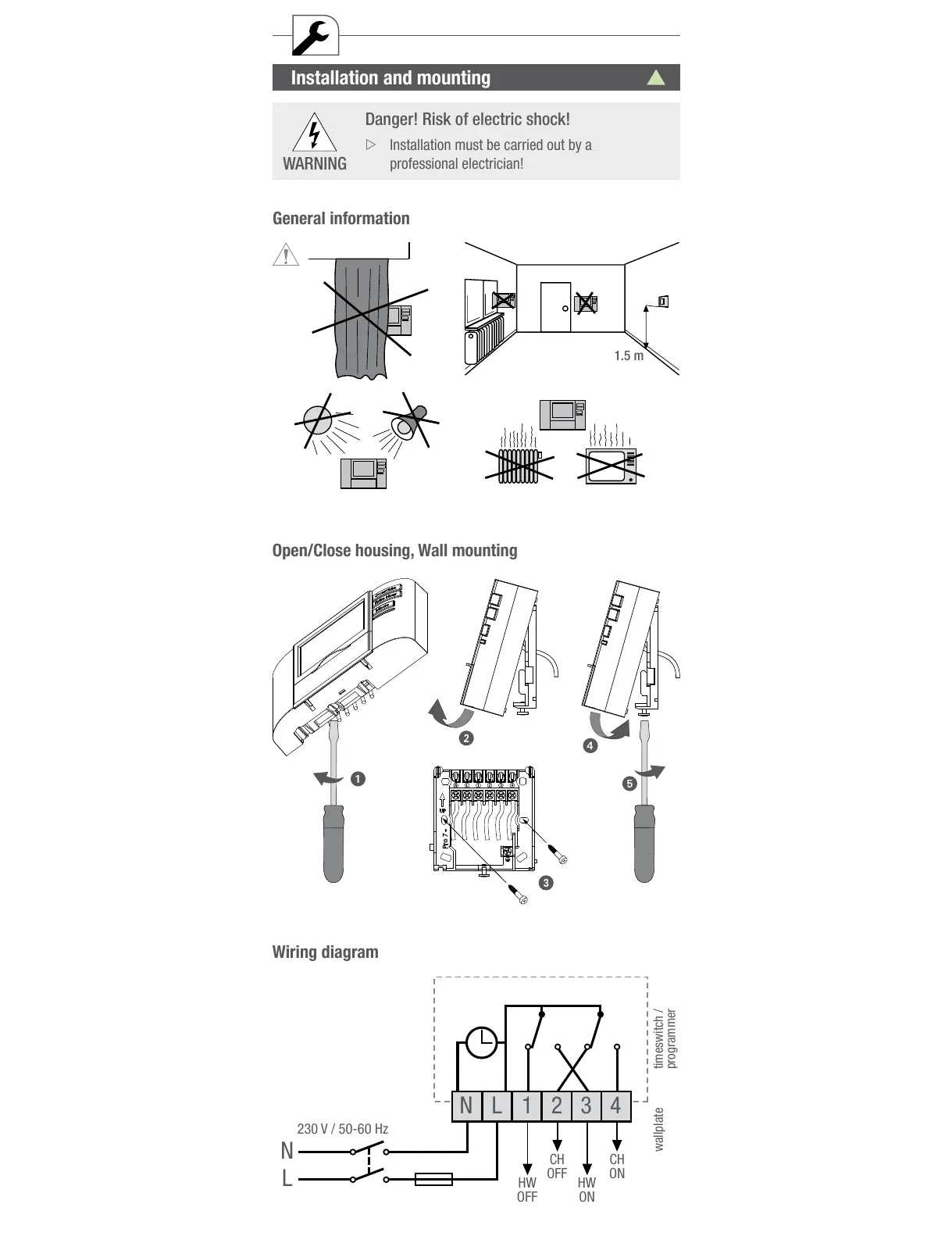 Grasslin QEG-2 - Installation and Mounting; Installation Safety and General Information; Housing and Wall Mounting Procedures; Electrical Wiring Diagram
