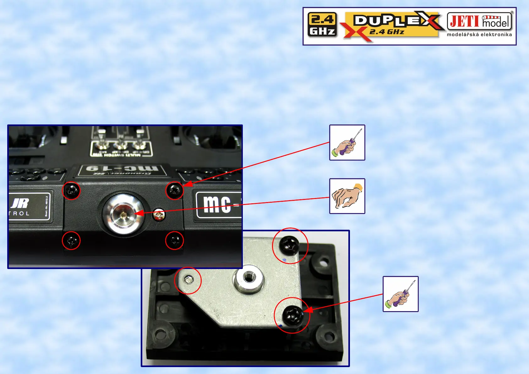 remove metal joint. Unscrew 4 screws that hold antenna plastic part in the transmitter and
