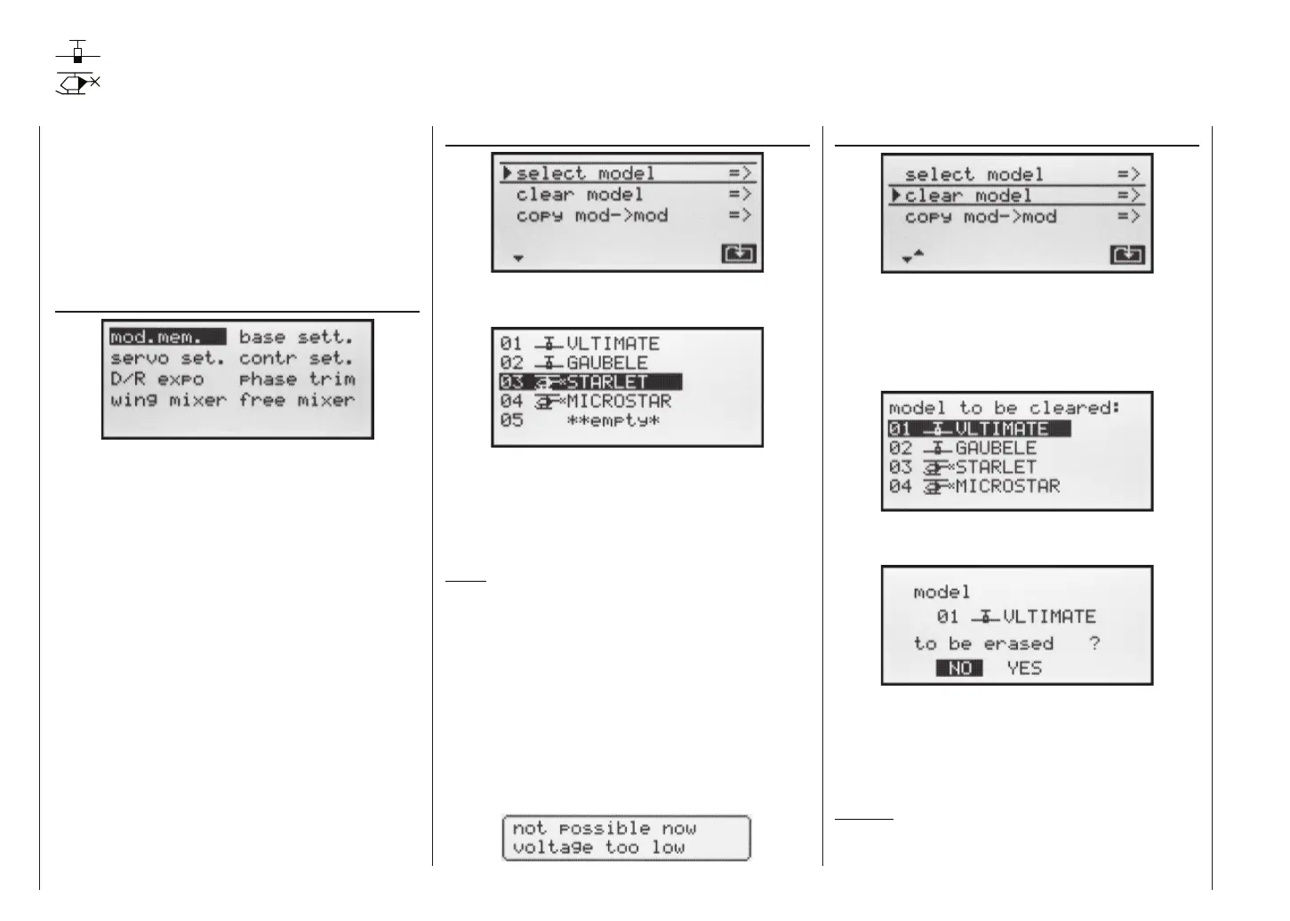 rocker button to select the »clear model« sub-menu,