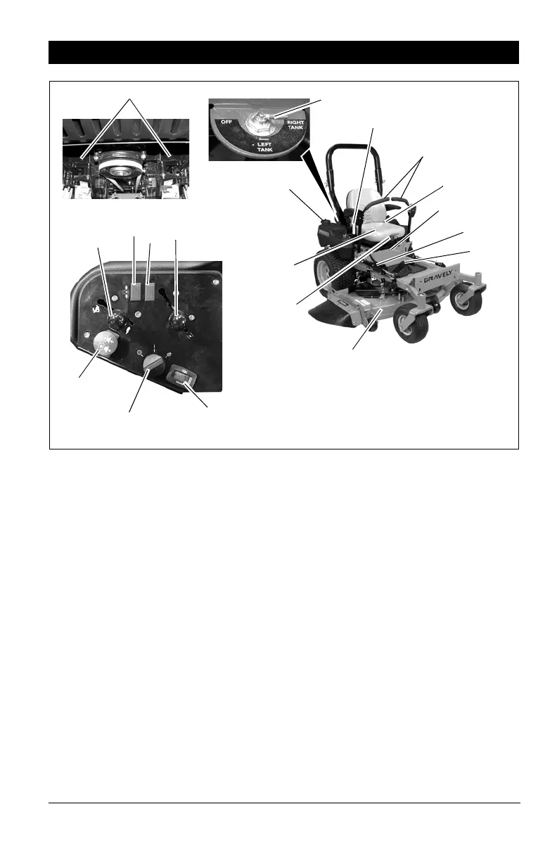 Gravely 991096 - Controls and Features Overview; Ignition and Fuel System Controls; Steering and Parking Controls; Mower Lift and PTO Controls