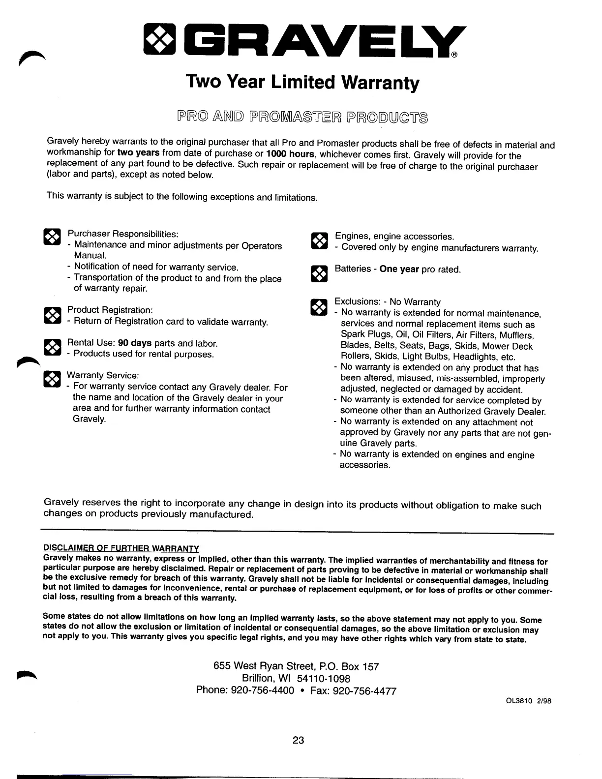 Gravely 992 - Two Year Limited Warranty; Warranty Coverage and Responsibilities; Warranty Exclusions and Disclaimer