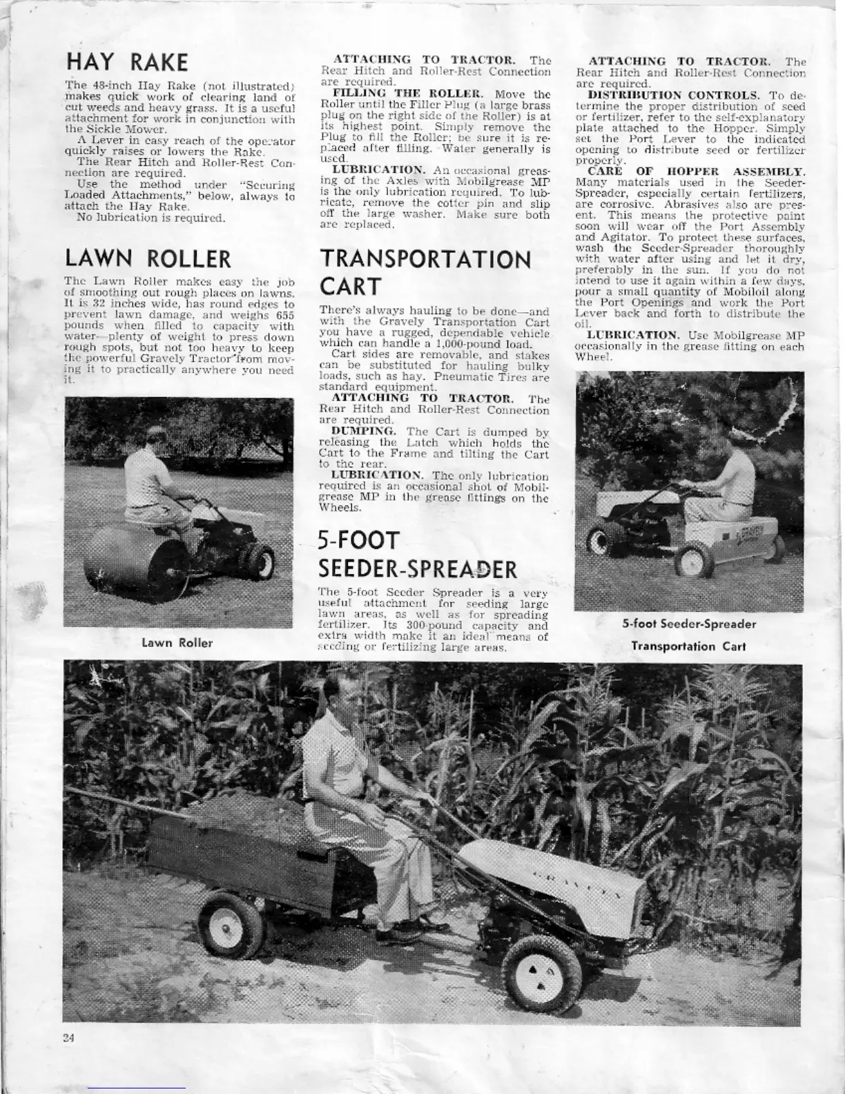 Gravely L 1963 - Hay Rake; Lawn Roller; Transportation Cart; 5-Foot Seeder-Spreader
