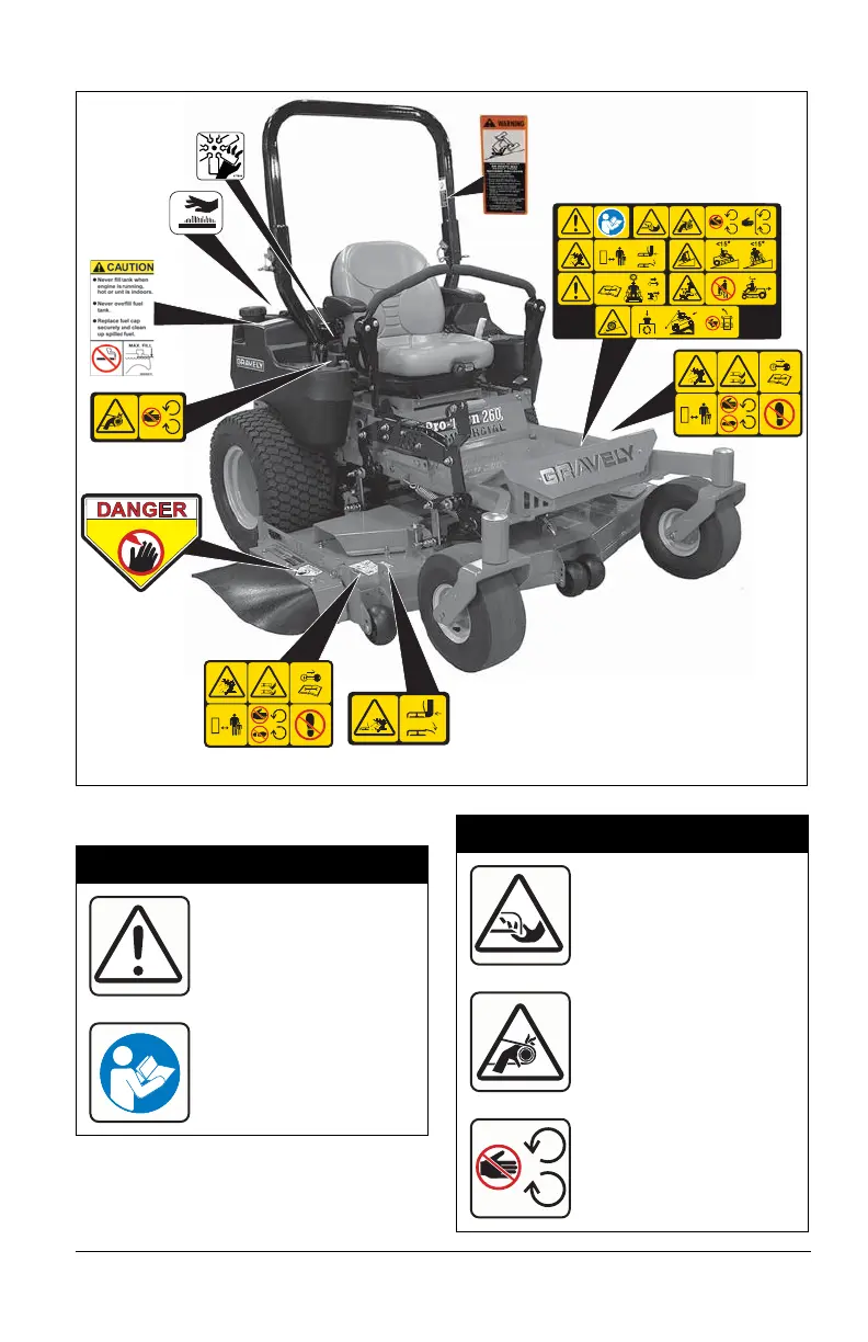 Gravely Pro-Turn 260 - Safety Decal Identification and Meaning; Danger and Warning Decals; Amputation Hazard Precautions