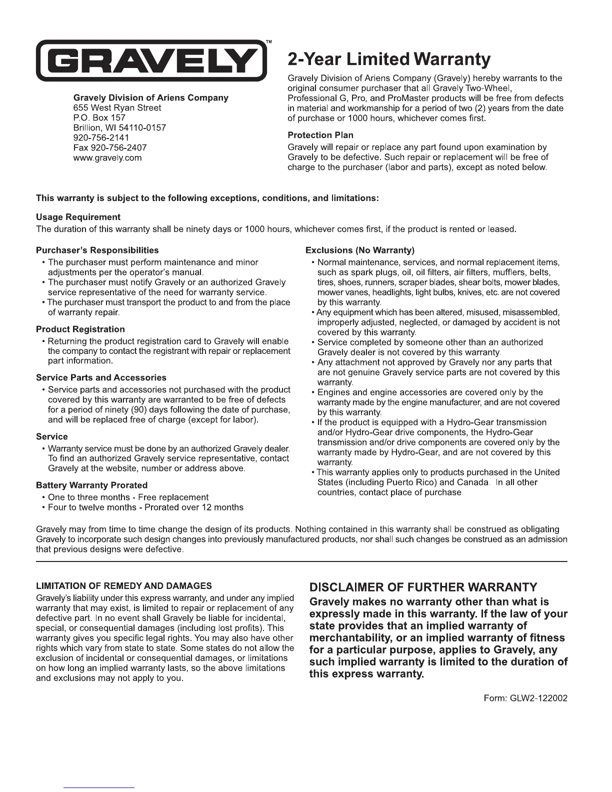 Gravely Promaster 34Z - Gravely Limited Warranty; Warranty Coverage and Purchaser Responsibilities; Exclusions and Limitations