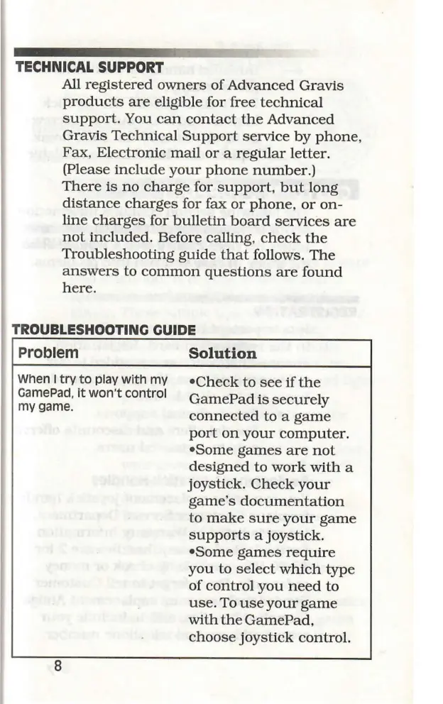 Gravis GamePad - Technical Support; Troubleshooting Guide