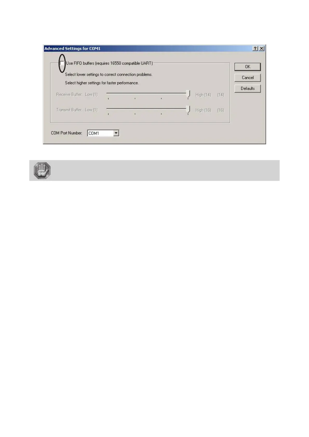 11. In the "Advanced Settings for COM" dialog , remove the "Use FIFO buffers" function which is activated