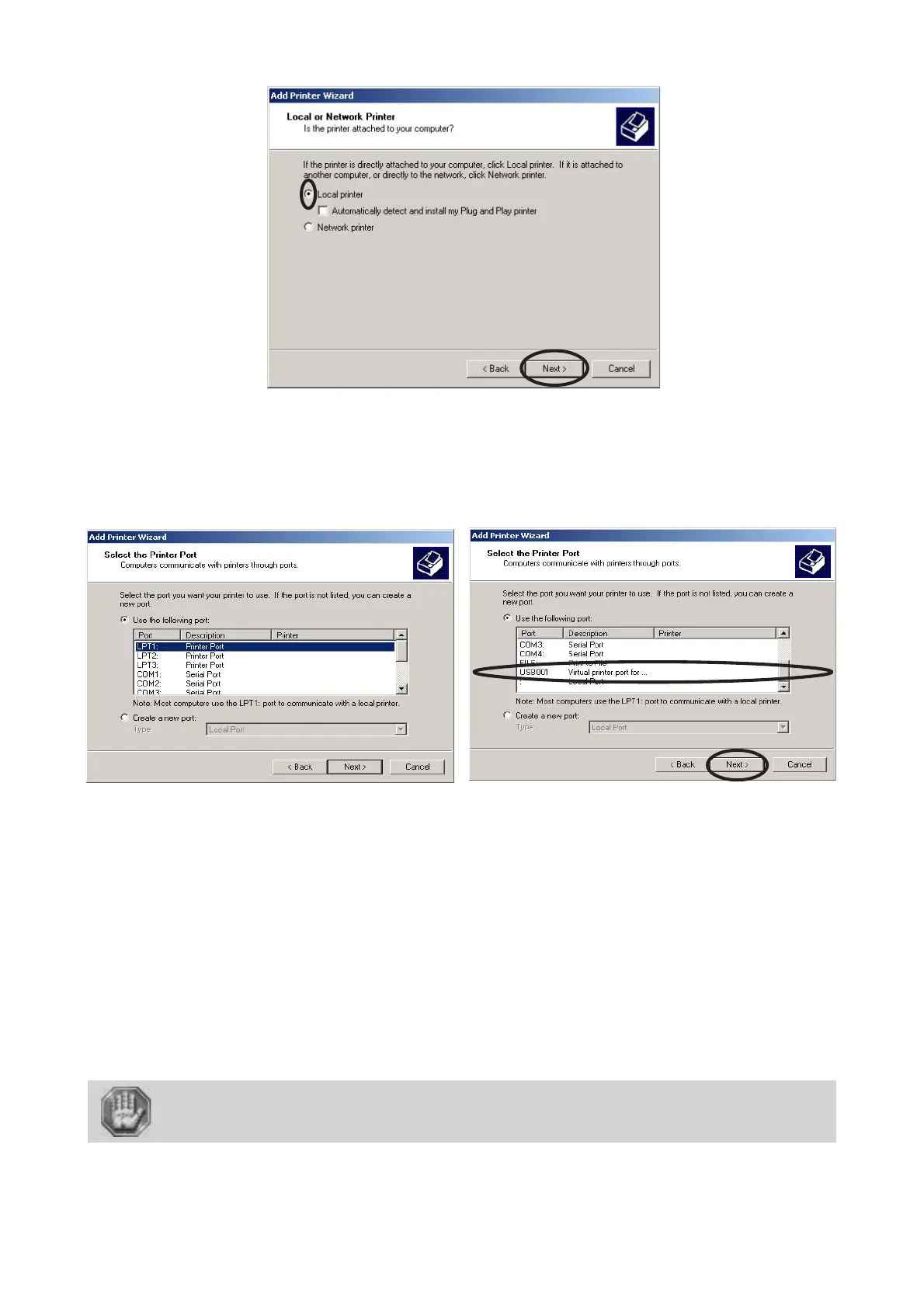 are connected and switched on, a virtual USB port is created automatically (ex: "USB001 (Virtual printer