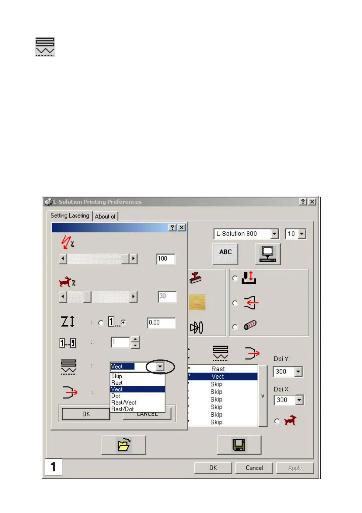 All the vectorial lines of that colour are processed and engraved as points. The lines set by scanning are ignored.