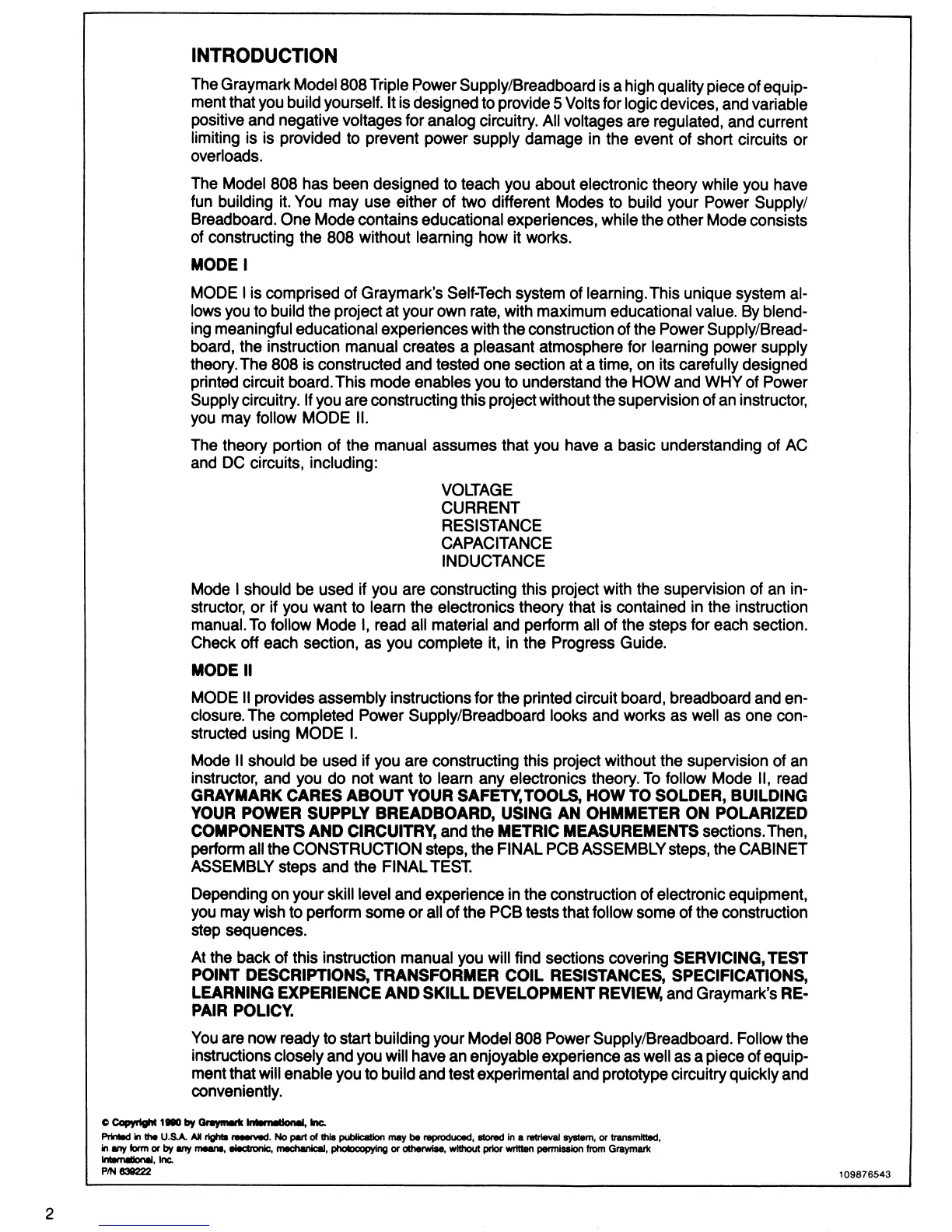 Graymark 808 - INTRODUCTION AND MODES; MODE I: SELF-TECH LEARNING SYSTEM; MODE II: ASSEMBLY WITHOUT THEORY