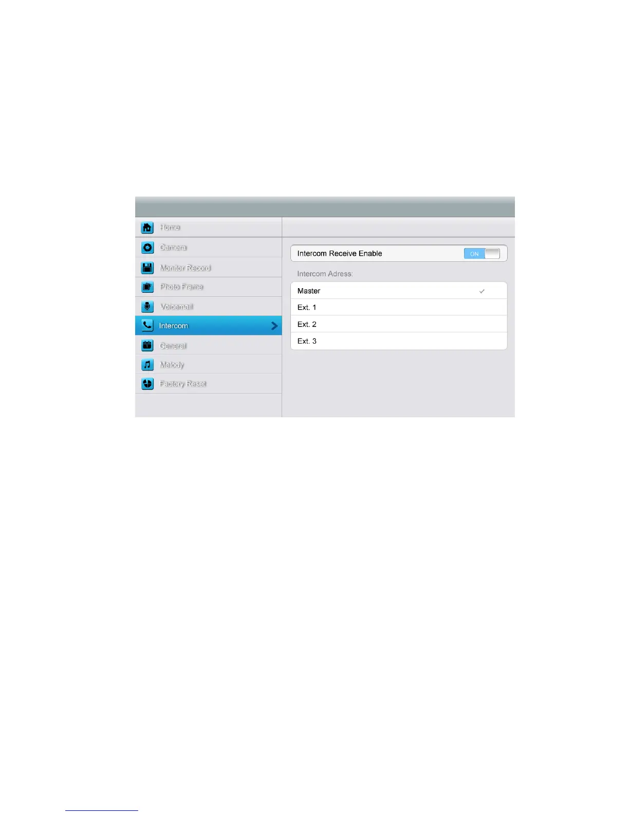 ¾ Set up intercom address. Main monitor should be set up as “Master”, extension