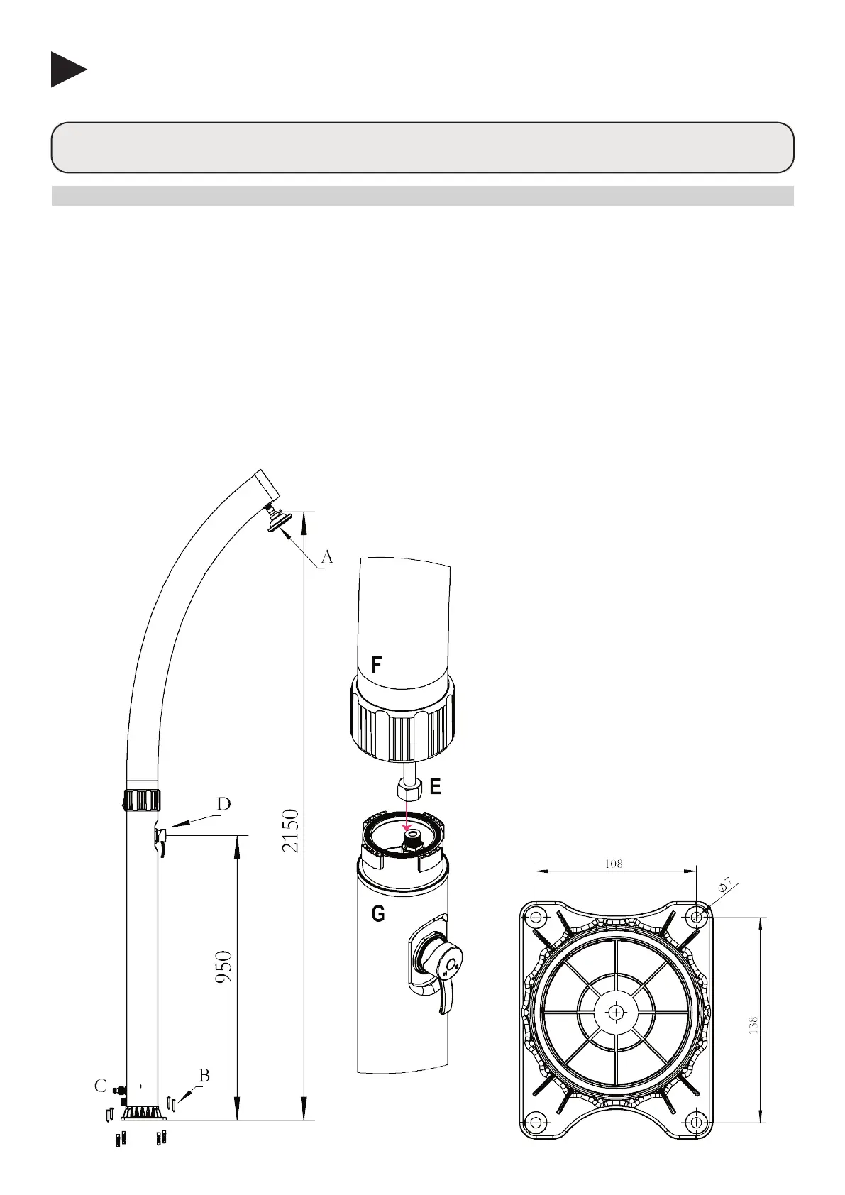 • Monteer de douche verticaal op de grond met B.