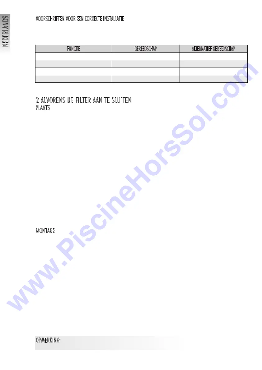 OPMERKING: Controleer met de slangen of het mogelijk is de filteruitrusting op een vlak en stevig oppervlak te installeren