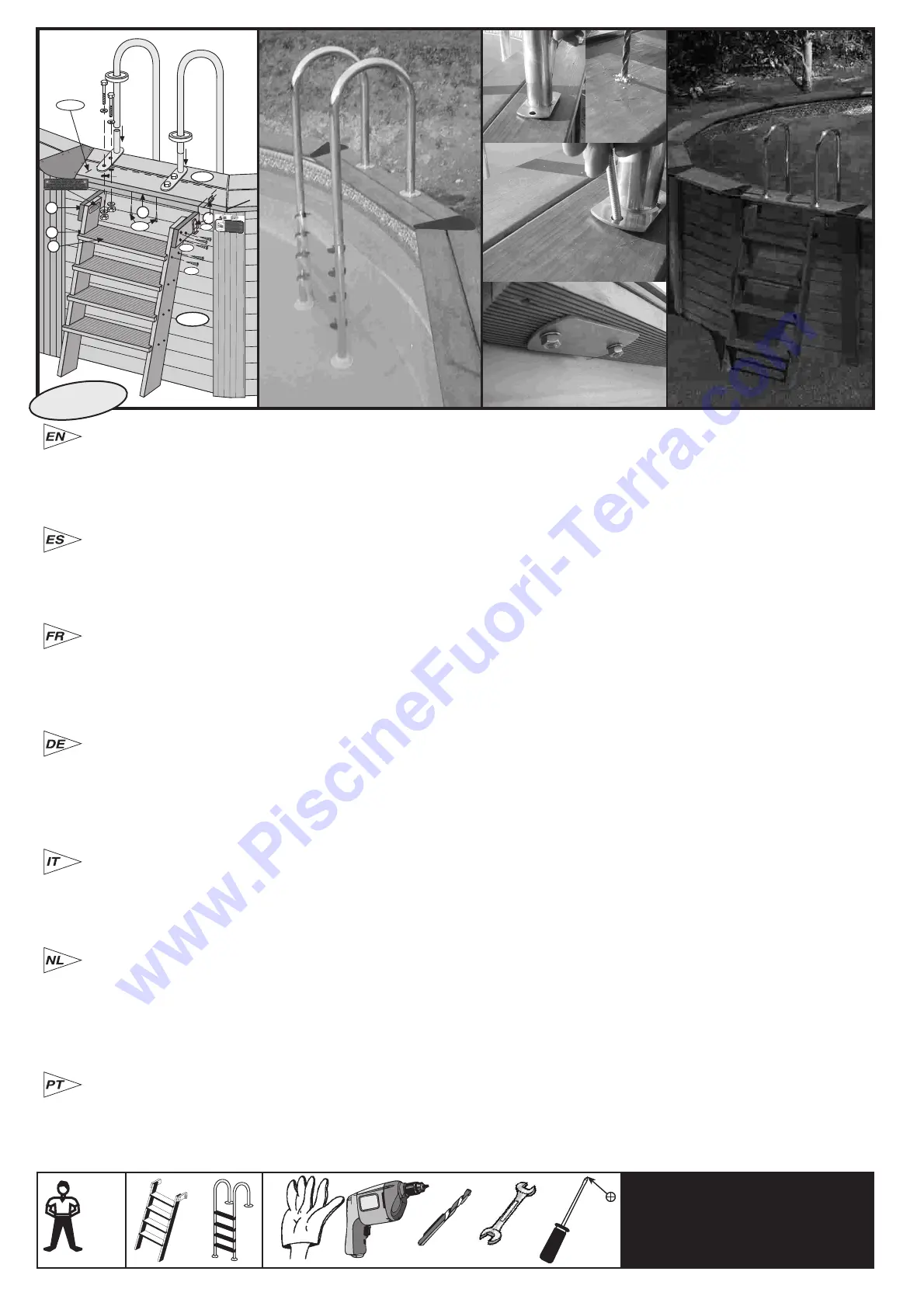 piscina para poder marcar los 4 agujeros (con taladro y broca Ø 10 mm) que tendrá que hacer en la playa exterior donde ha situado la escalera de madera. Deberá taladrar la playa exterior