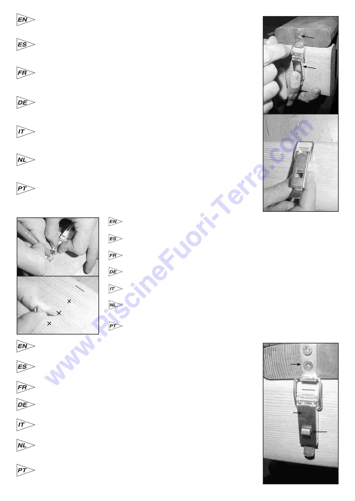 Apertar os 3 tira fundos da peça de enganche E2 para poder enganchar a escada na peça enganche E1 da piscina