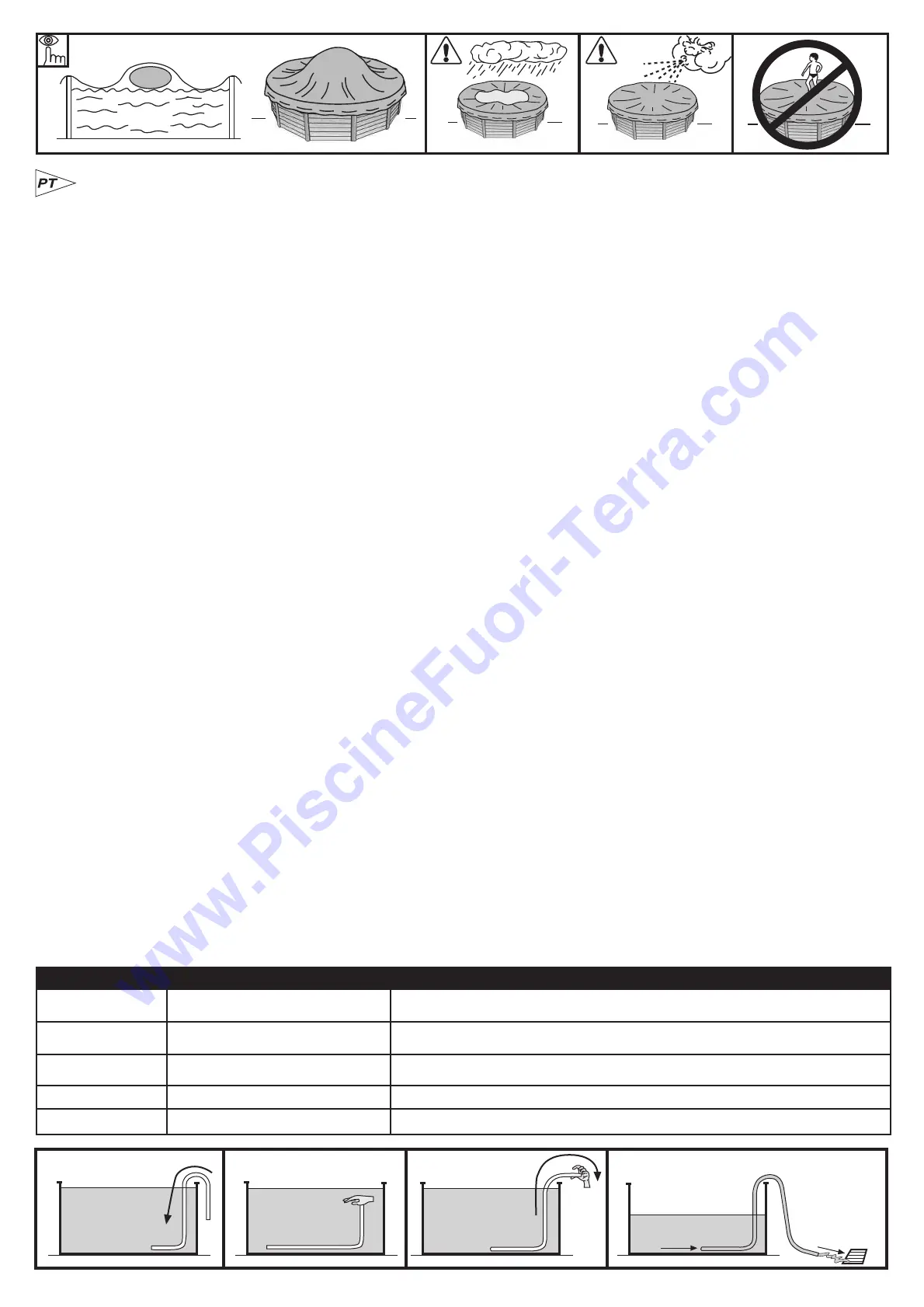 PARA UTILIZAR DE NOVO: Tirar a coberta de Inverno, instalar o depurador, despejar pelo menos 1/3 da água e realizar uma cloragem de choque. Pôr o depurador em funcionamento