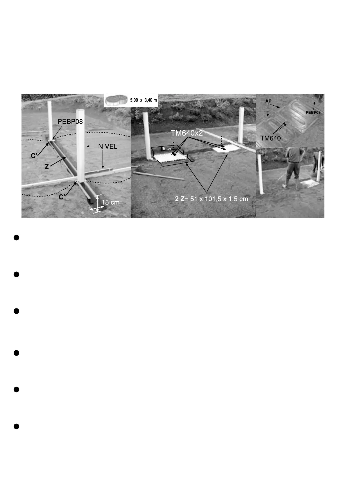 NB: If the level controls of the columns (C) and pressure blade (AP) are not respected, the pool will not be mounted properly. Then, you will have to repeat the installation process.