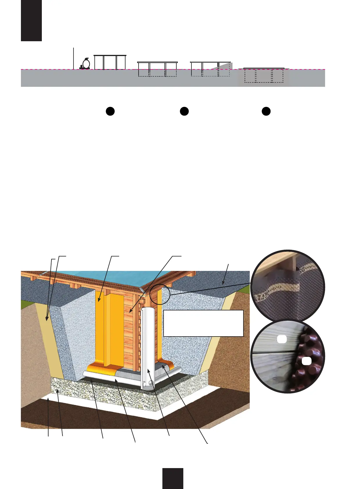 Zgodnie z rodzajem terenu, należy zainstalować drenaż obwodowy i połączyć go ze studnią dekompresyjną. Studnia zostanie wykopana przed budową