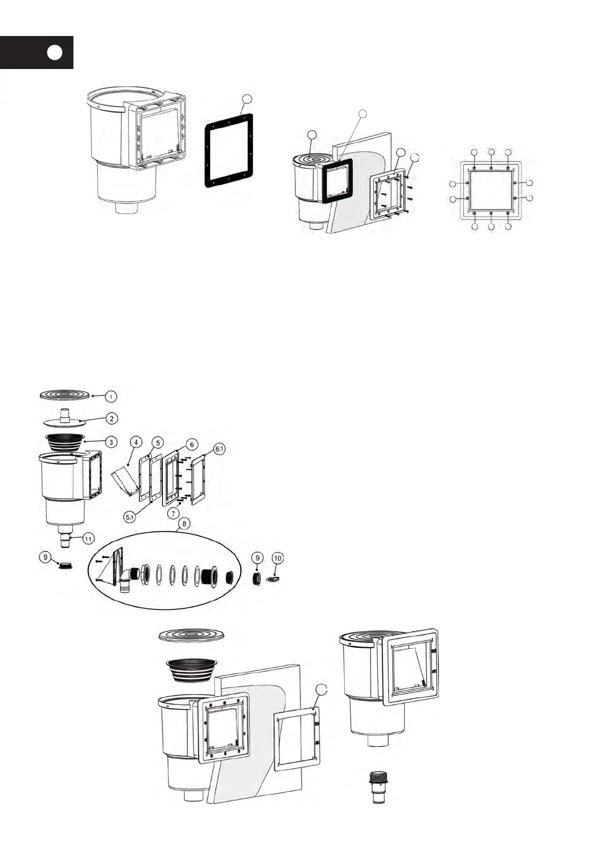 • Platzieren Sie die zweite quadratische Flachdichtung (5.1) und danach den Flansch (6) gegen den Skimmer und richten Sie die Öffnungen an den Mar-