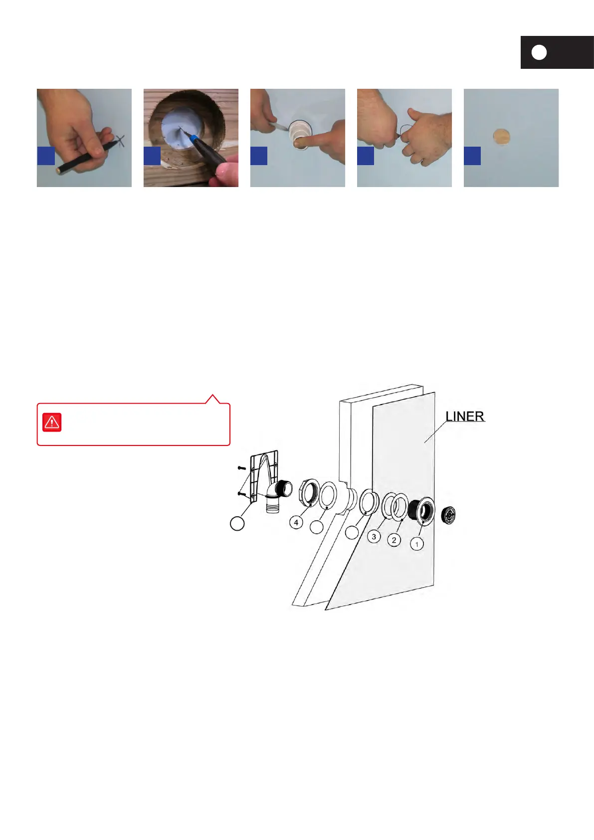 Por dentro da piscina, introduza, através do corte (C), a válvula de retorno (No 1) com um dos anéis de fricção