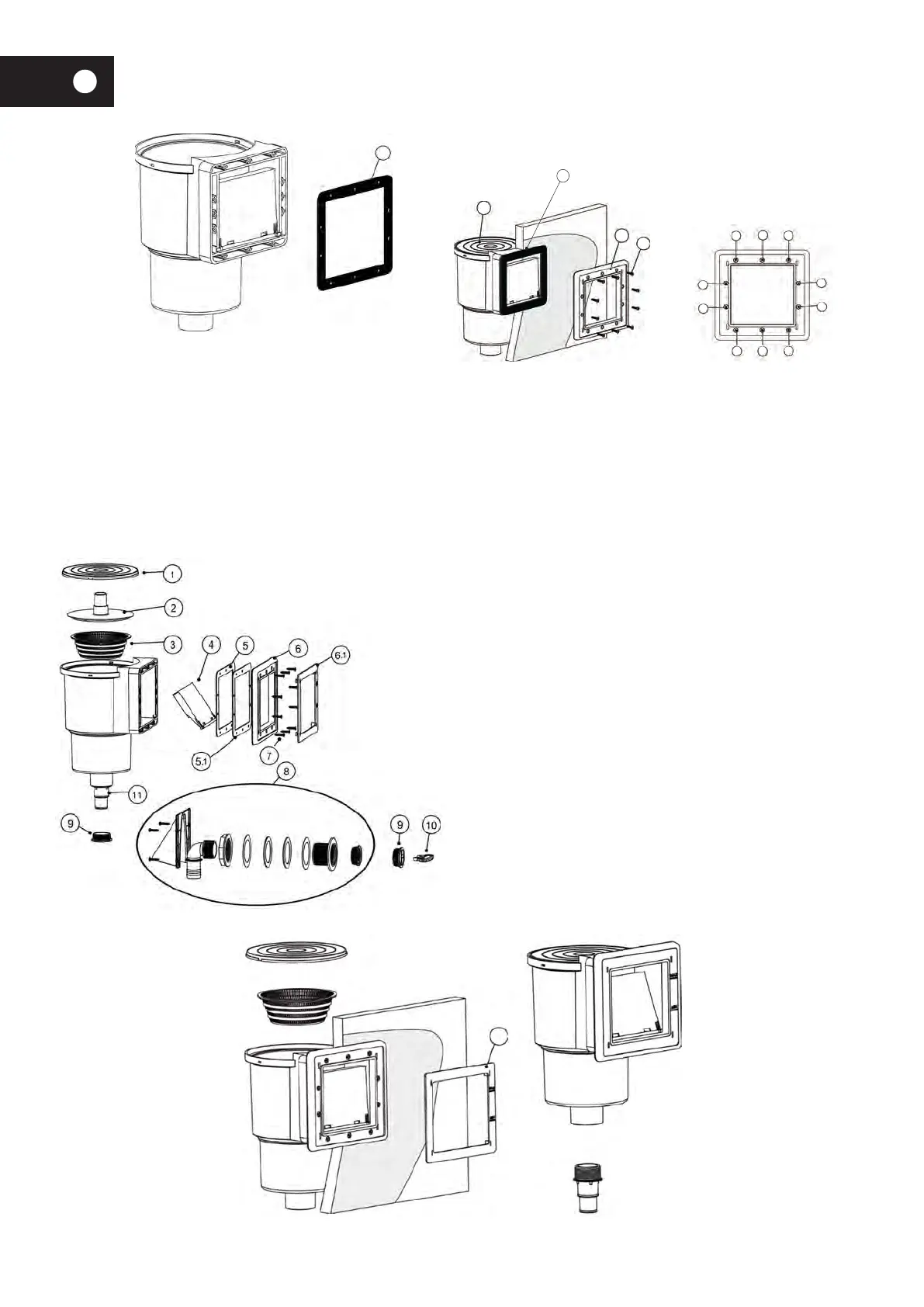• Placez le 2ème joint plat carré (5.1) puis la bride (6) contre le liner en alignant les trous avec les tracés d’emplacement des vis.