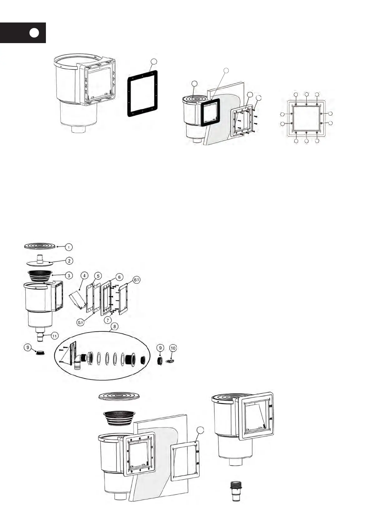 • Platzieren Sie die zweite quadratische Flachdichtung (5.1) und danach den Flansch (6) gegen den Skimmer und richten Sie die Öffnungen an den Mar-