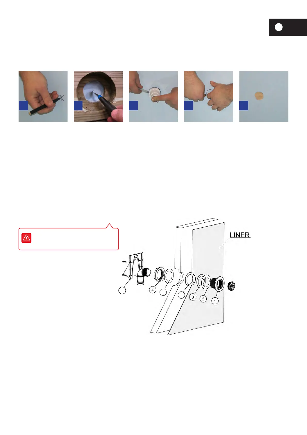 Por dentro da piscina, introduza, através do corte (C), a válvula de retorno (No 1) com um dos anéis de fricção