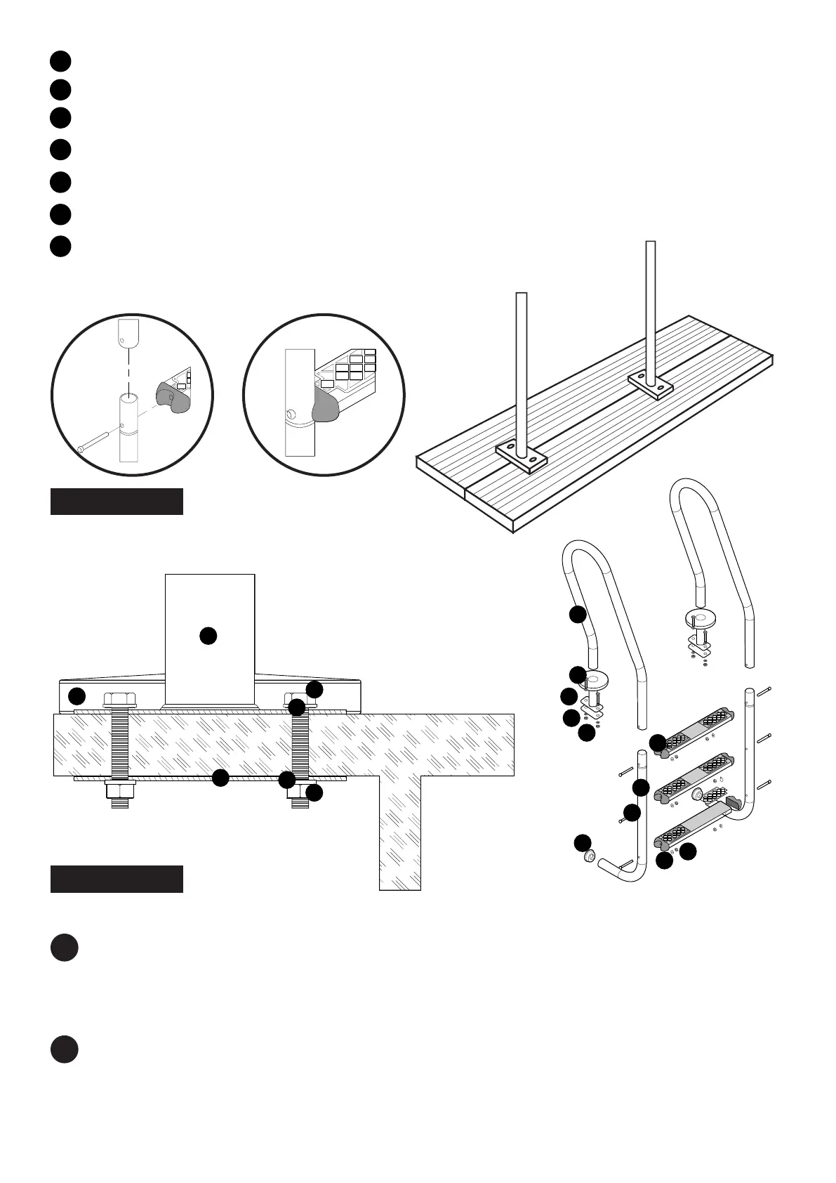 B.- Assemble the end pieces (12) of the handrail so that the ladder cannot damage the pool.