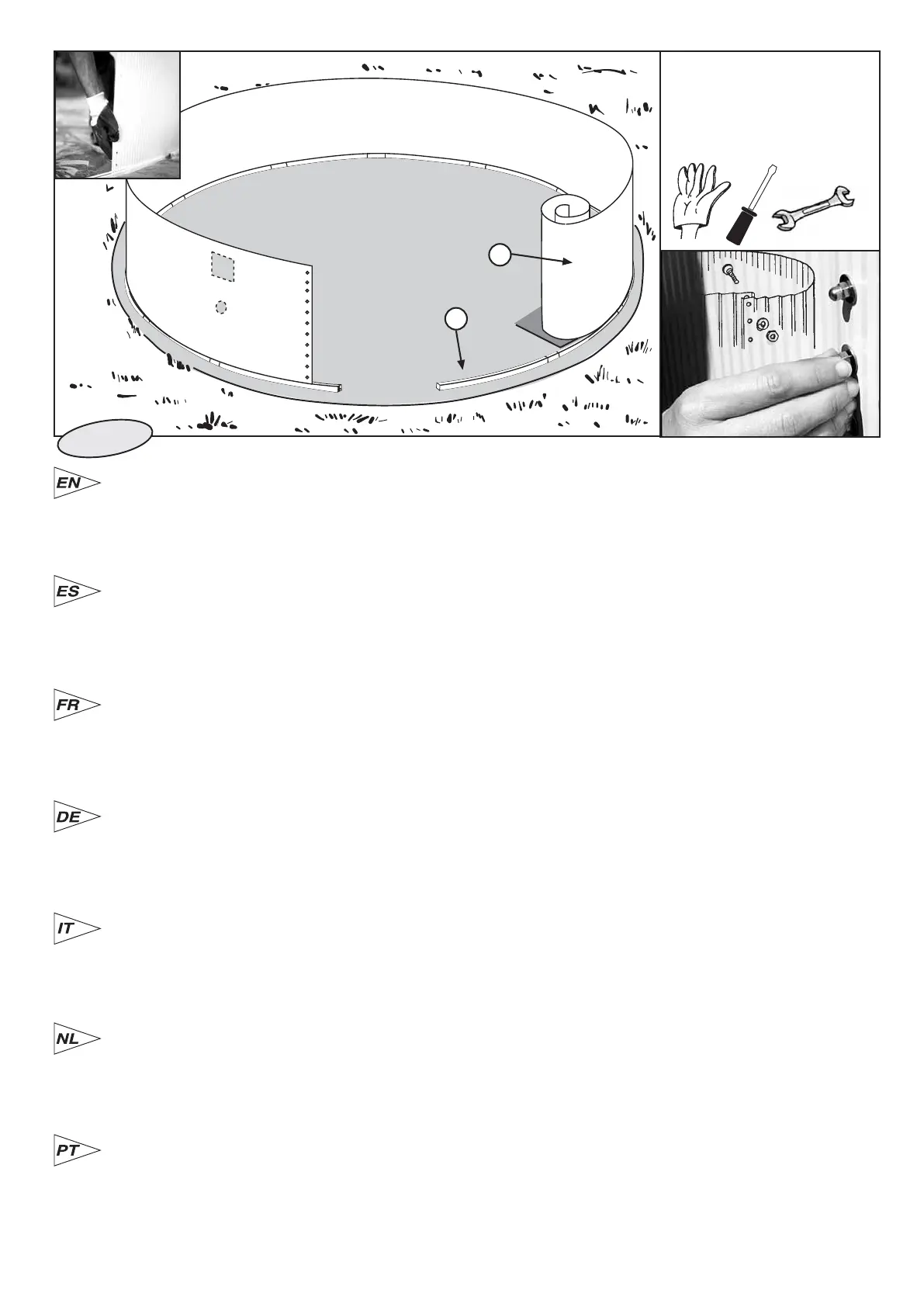 Compléter le cercle et fermer la tôle CH avec les vis TT. La tête de la vis doit rester dans la partie intérieure de la piscine, la rondelle et l’écrou