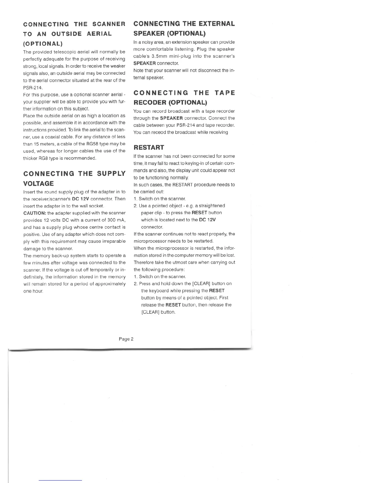 GRE PSR-214 - Connecting the Scanner to an Outside Aerial; Connecting the External Speaker; Connecting the Tape Recorder, Supply Voltage; Restart