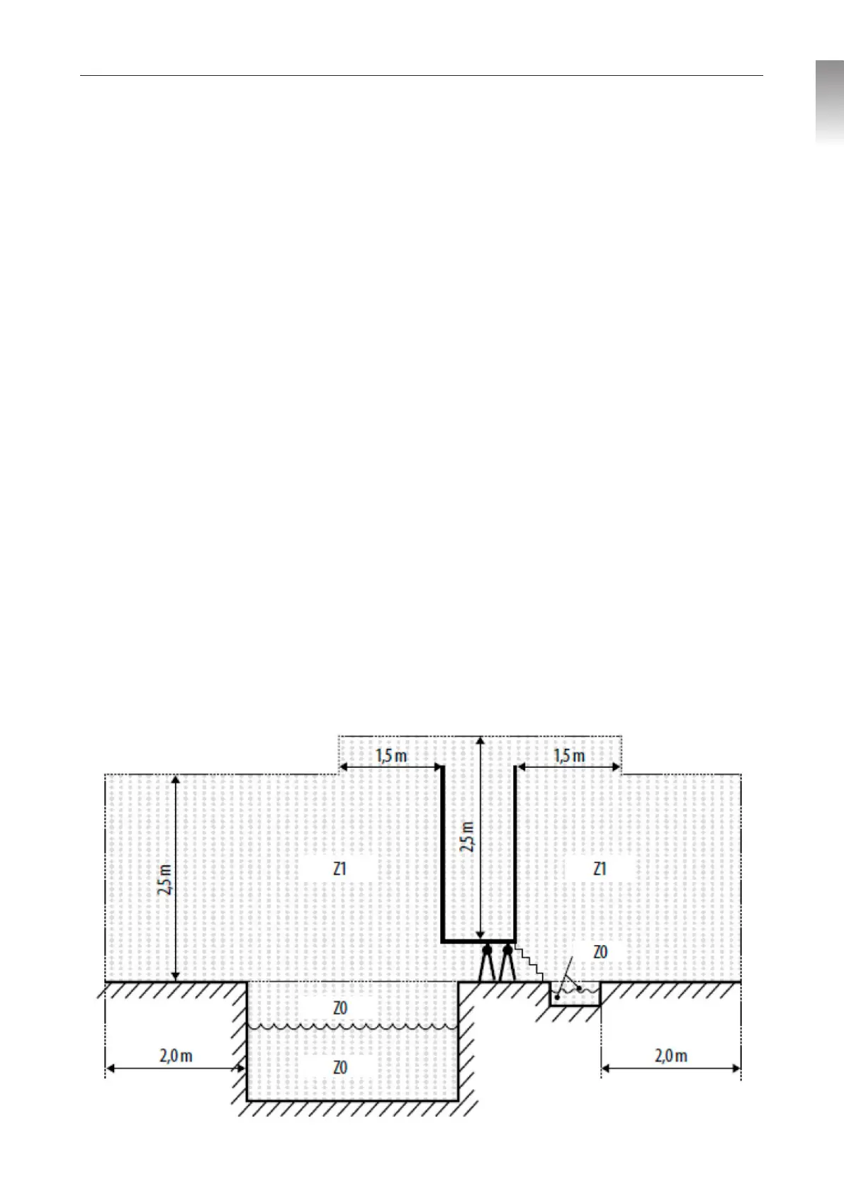 I en afstand af 2 meter fra bassinkanten for at forhindre vand i at sprøjte på enheden. Nogle standarder tillader