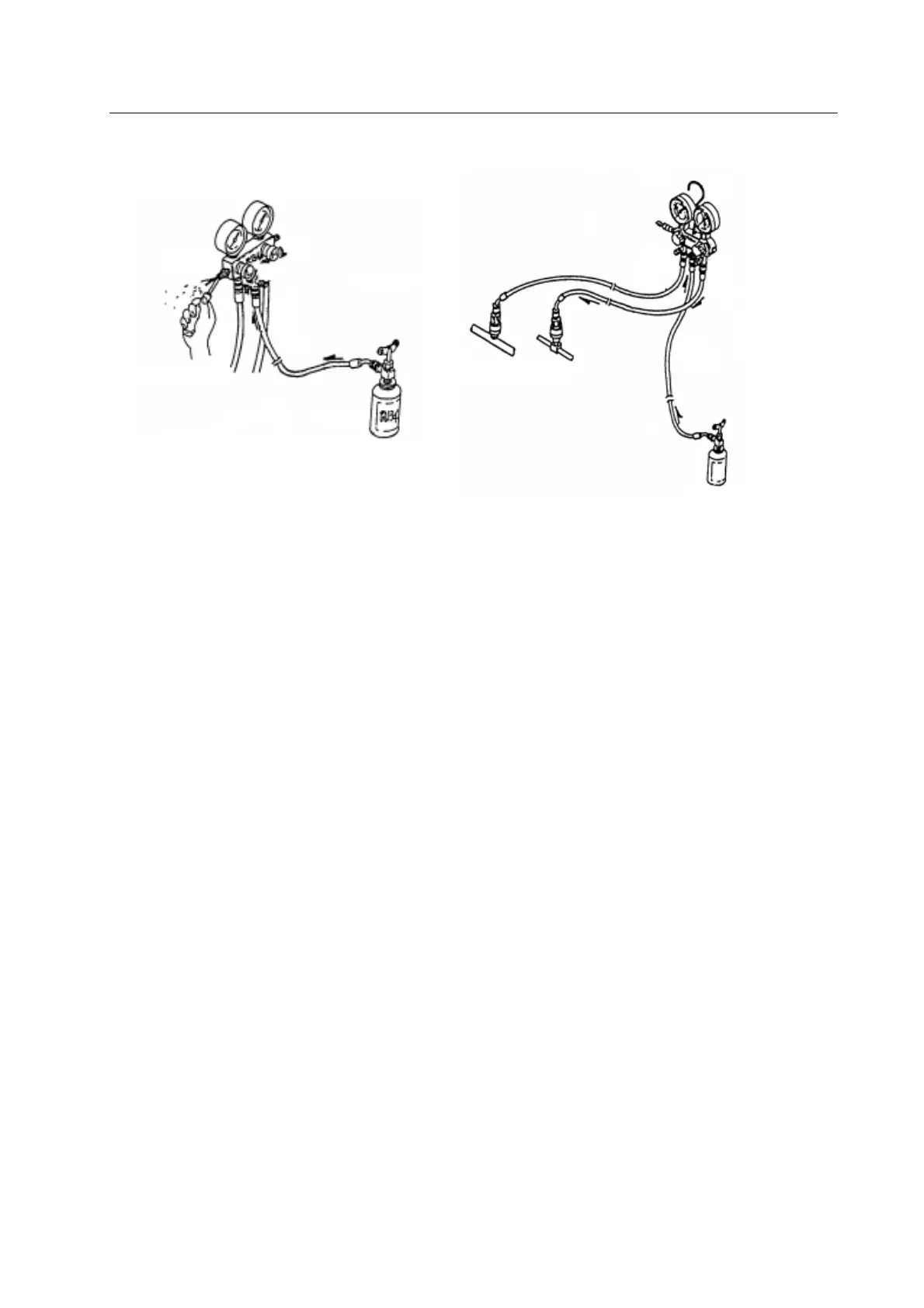 When injecting the refrigerant, carefully observe the high-pressure side of the manifold pressure gauge and the flow condition of