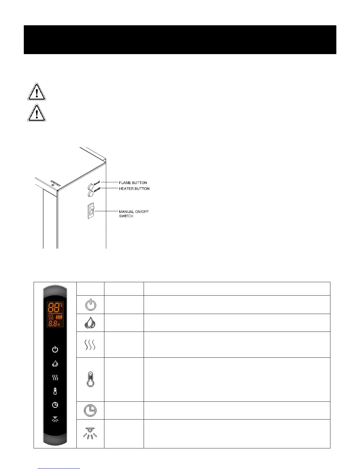 This appliance can be operated by both remote control and manual buttons located on the side of the fire box. Once the