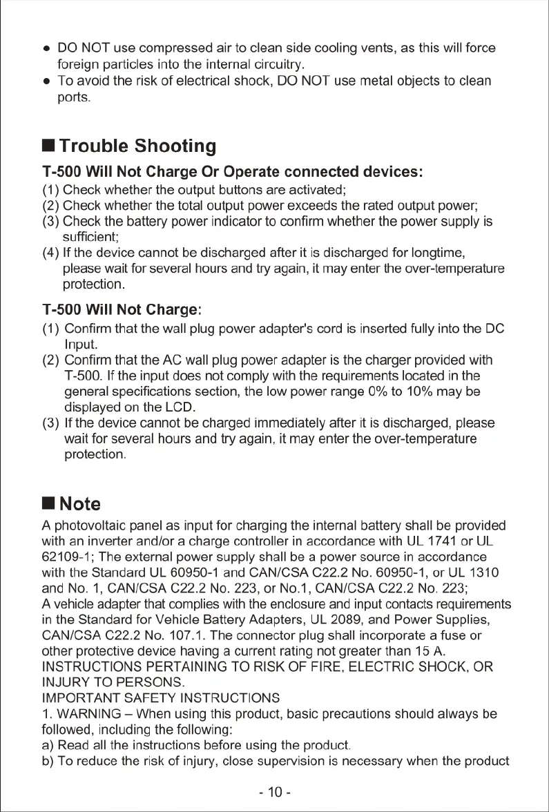 GRECELL T500 - Troubleshooting; Device Not Charging or Operating; Device Not Charging