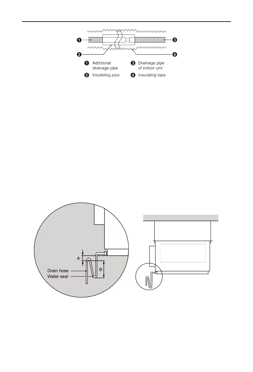 Drain hose is in negative pressure state: A = B≥P/10+20 (mm).