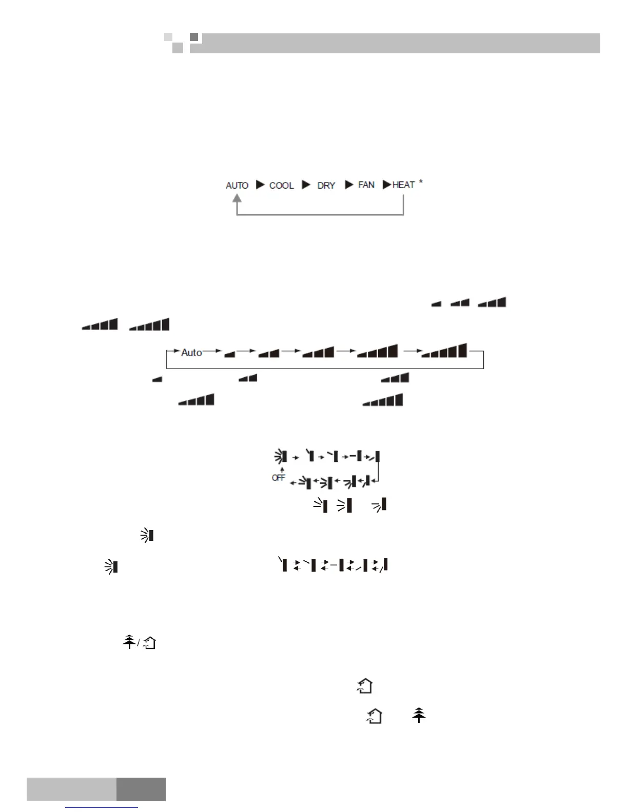 Each time you press this button, a mode is selected COOL, DRY, FAN, and HEAT *, as the following: