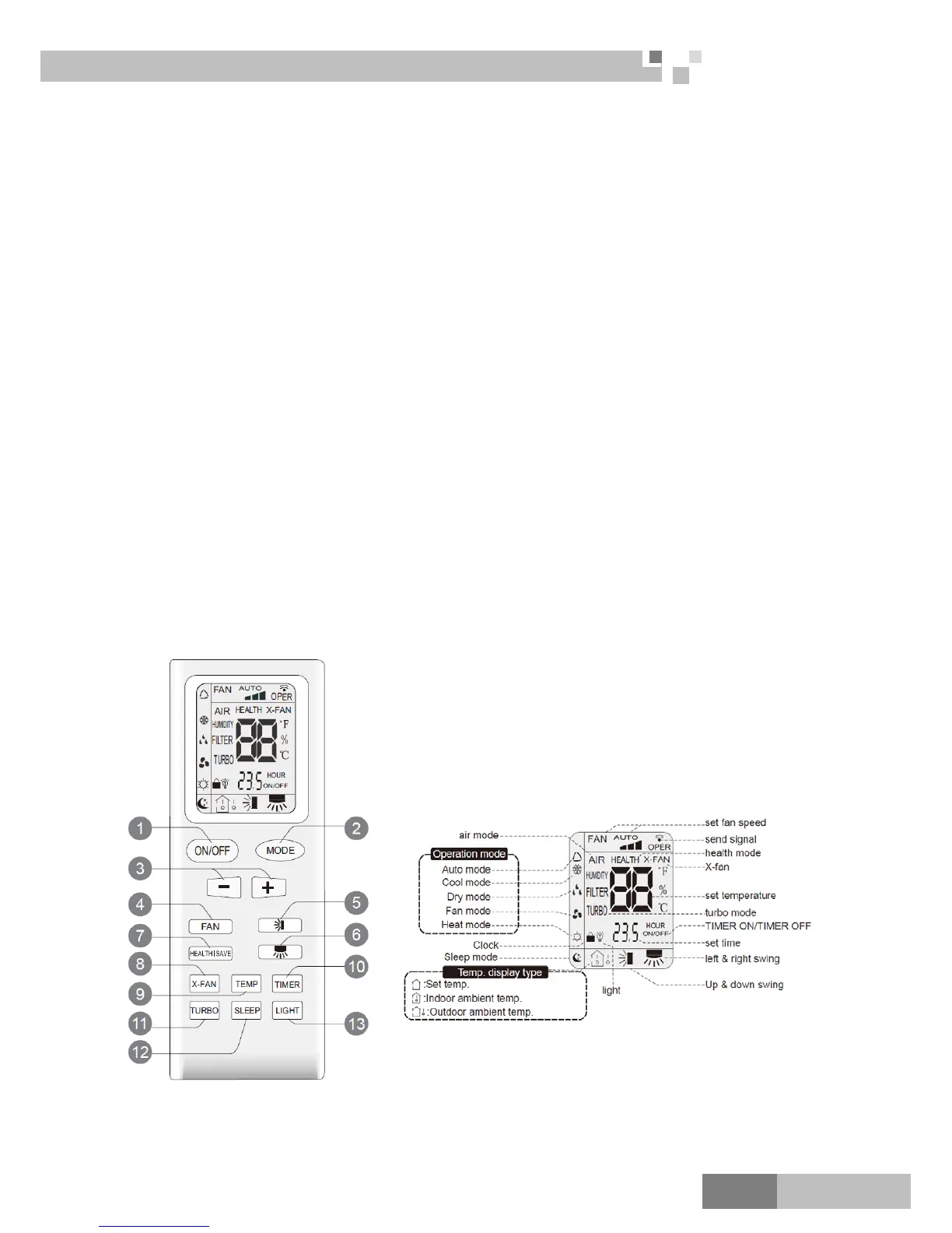 Press this button can turn on or turn off the air conditioner. After turning on the unit, operation indicator