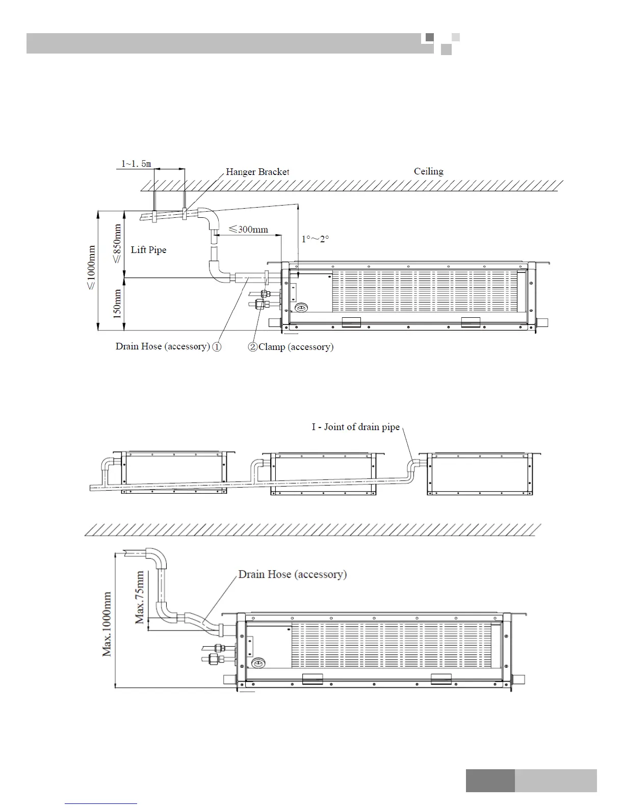 angle 1°~2°for the lift pipe toward the drainage direction. If the lift pipe and the unit form a right angle, the