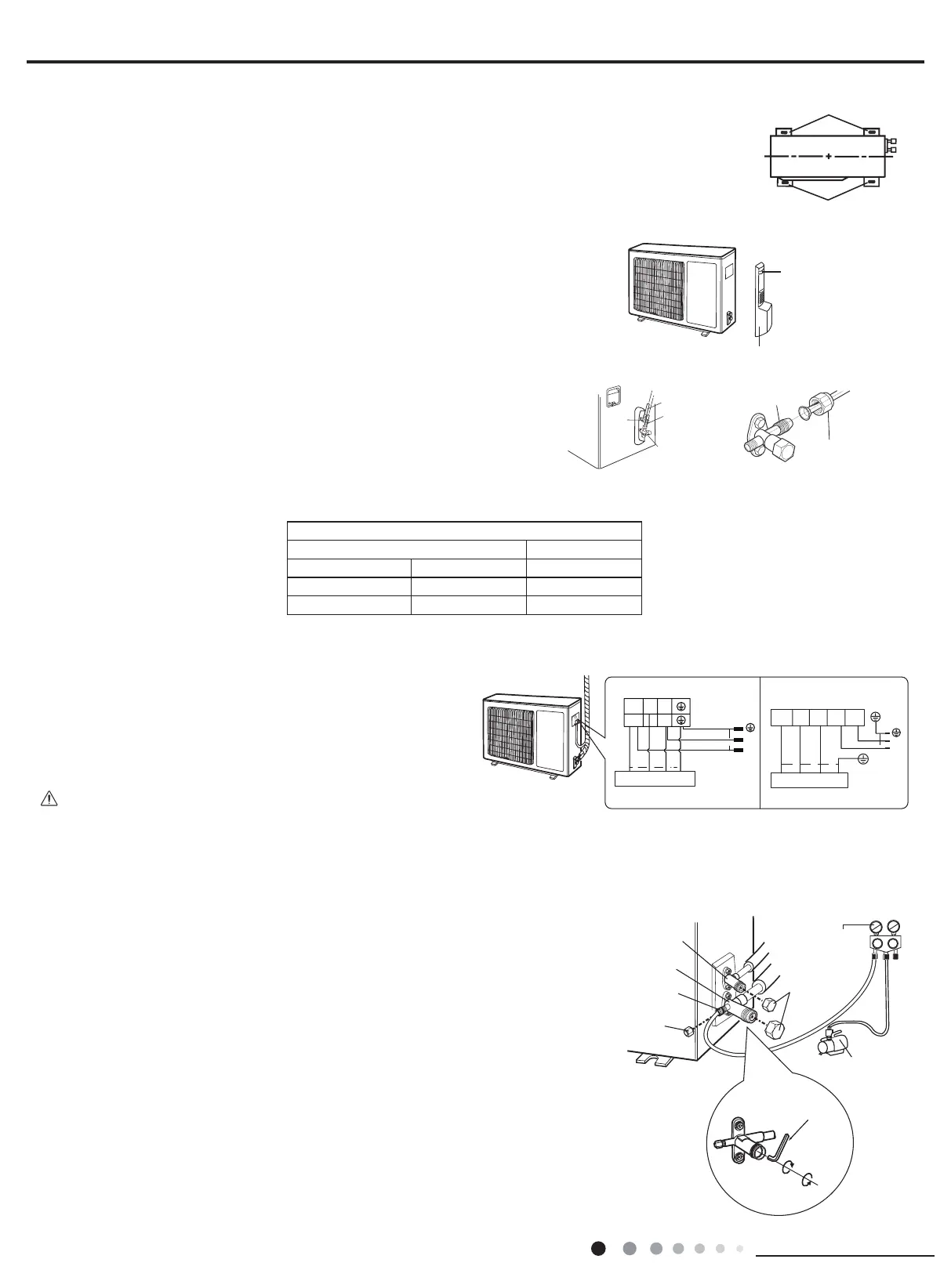 (1) Place the outdoor unit on the support. (2) Fix the foot holes of outdoor unit with bolts.