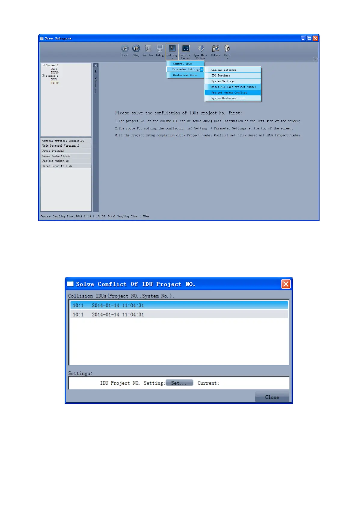 conflicting IDU box, showing the IDU's project number, system number and time; setting box, showing