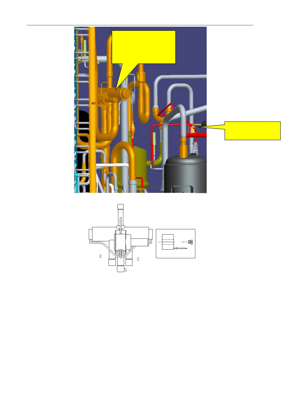 Labels on the 4-way valve and their meanings: D – connects to exhaust; E – connects to IDU