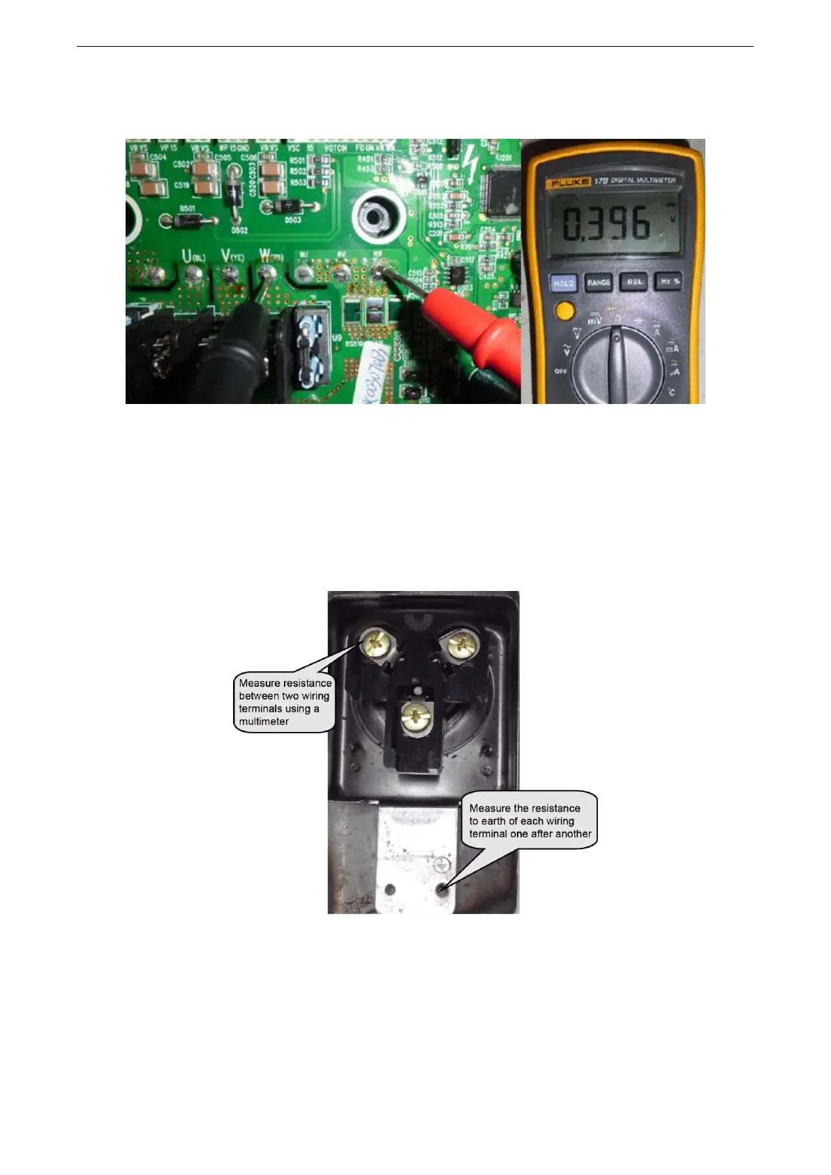 Measure resistance between two wiring terminals (U, V, W). The resistance value range should be
