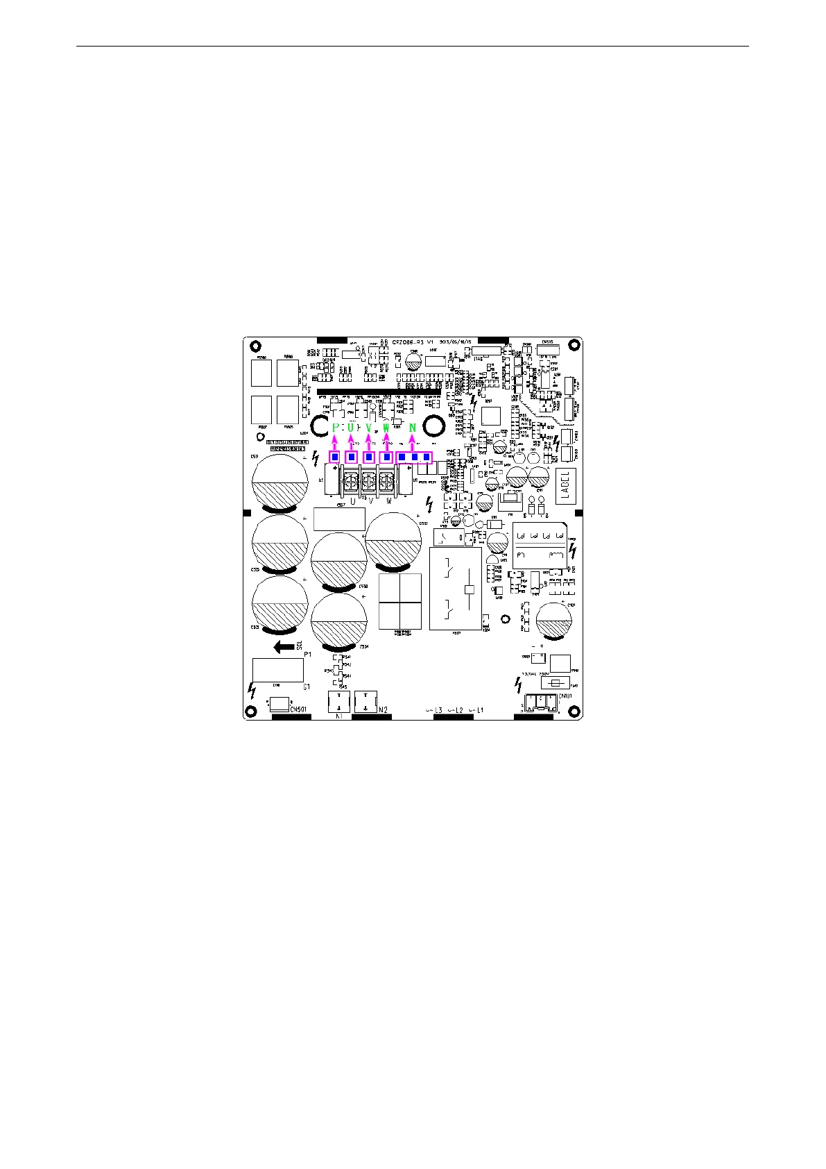 2. Measure compressor drive DC bus voltage between two wire terminals of P, U, V, W and N. Set