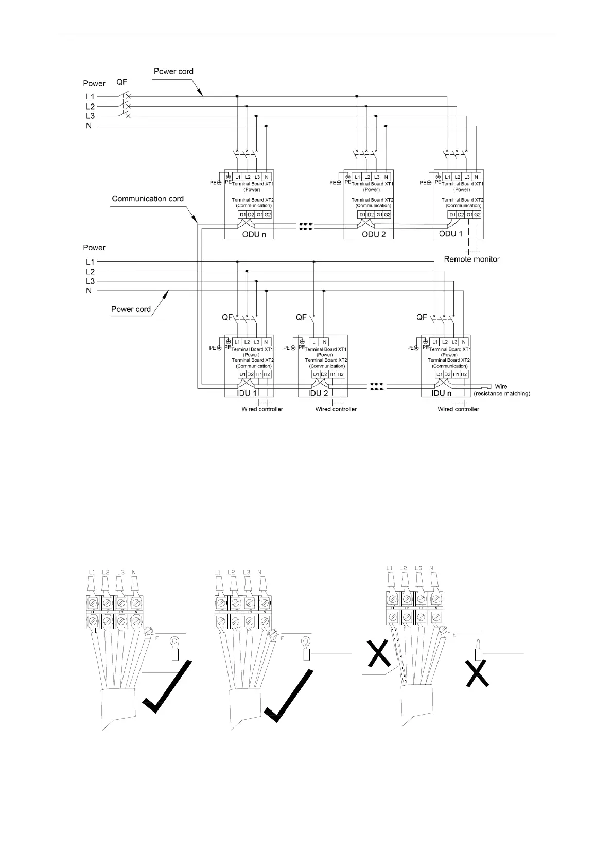 power cable, and the grounding cable to L1, L2, L3, and N on the power terminal block and the