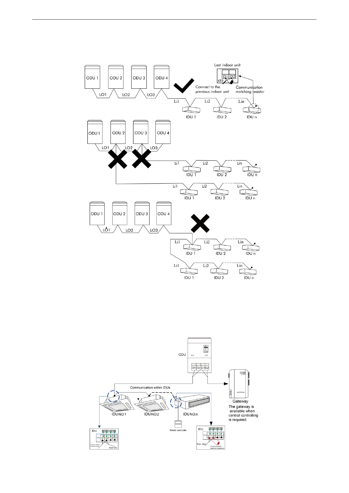 The communication bus of indoor and ODUs must be connected in series instead of in star mode.