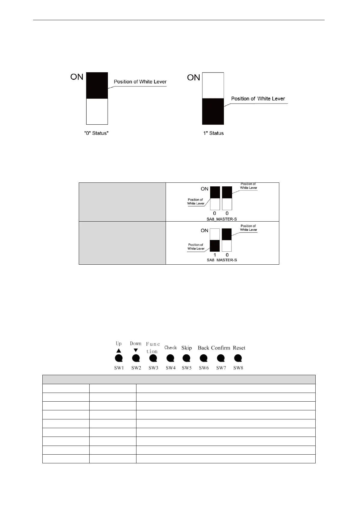 On the DIP switch, “ON” indicates “0” status and the opposite direction indicates "1” status.