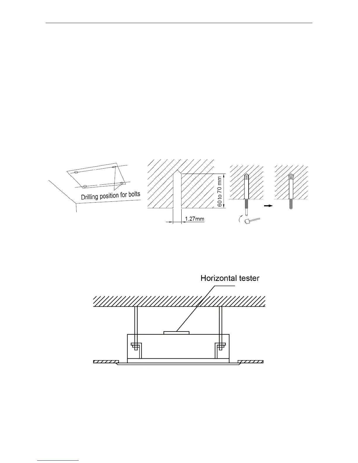 (2) Install the bolts to the ceiling at a place strong enough to hang the unit. Mark the bolt positions